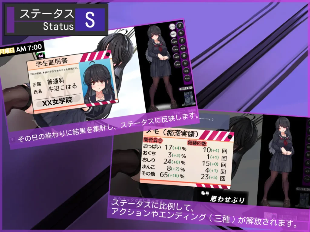 警戒値・欲情値・絶頂値の3ゲージを管理しながら、日ごとに新たな行動を解放し、内気で自信のない巨乳JK・こはるをゆっくり快楽に染めていく構造。