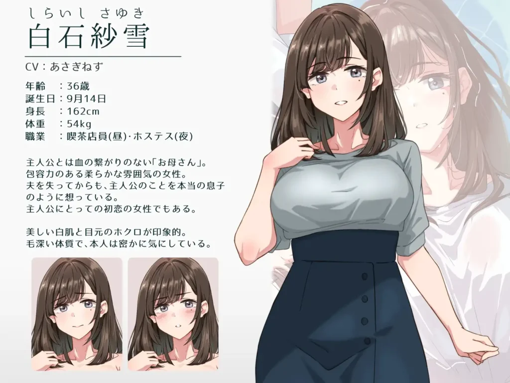 白石 紗雪義母 / 未亡人 / 年上包容力があり柔らかな雰囲気。昼と夜で働き家庭を支えるが、若い男・井澤に狙われる。