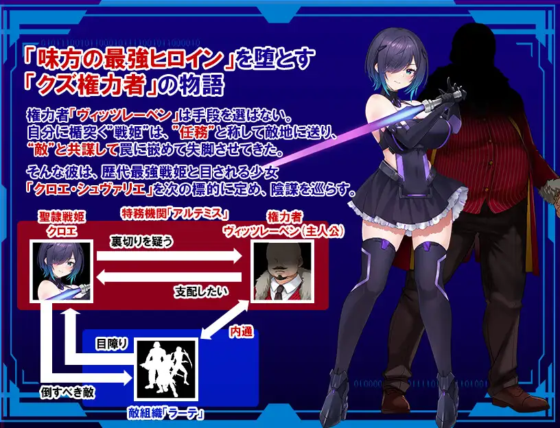 サークル「一歩も下がるな!!!」による、“悪役主人公”視点の戦略×調教×戦闘エロRPG。