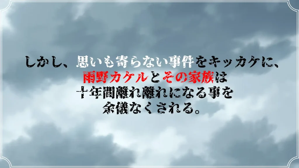 主人公カケルが幼少期に失った家族の真相を追い、10年ぶりに帰郷。
