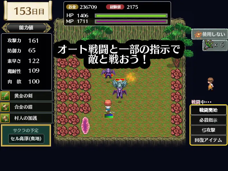 • 固定日数で強制戦闘が発生:計画的な育成が必要、未達成だとゲームオーバー。