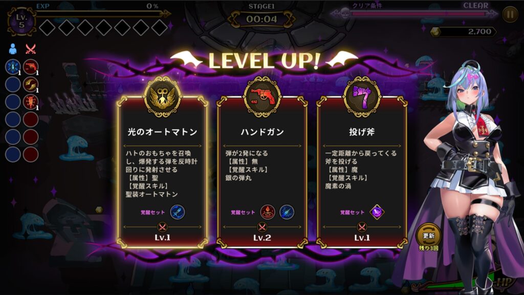 悪霊を倒しレベルアップを重ねながら、スキルを組み合わせて覚醒技を発動。
