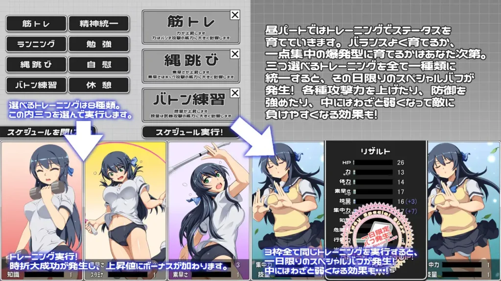 昼はトレーニングで能力を鍛え、夜は戦闘かエロ配信かを選択して進める二部制。